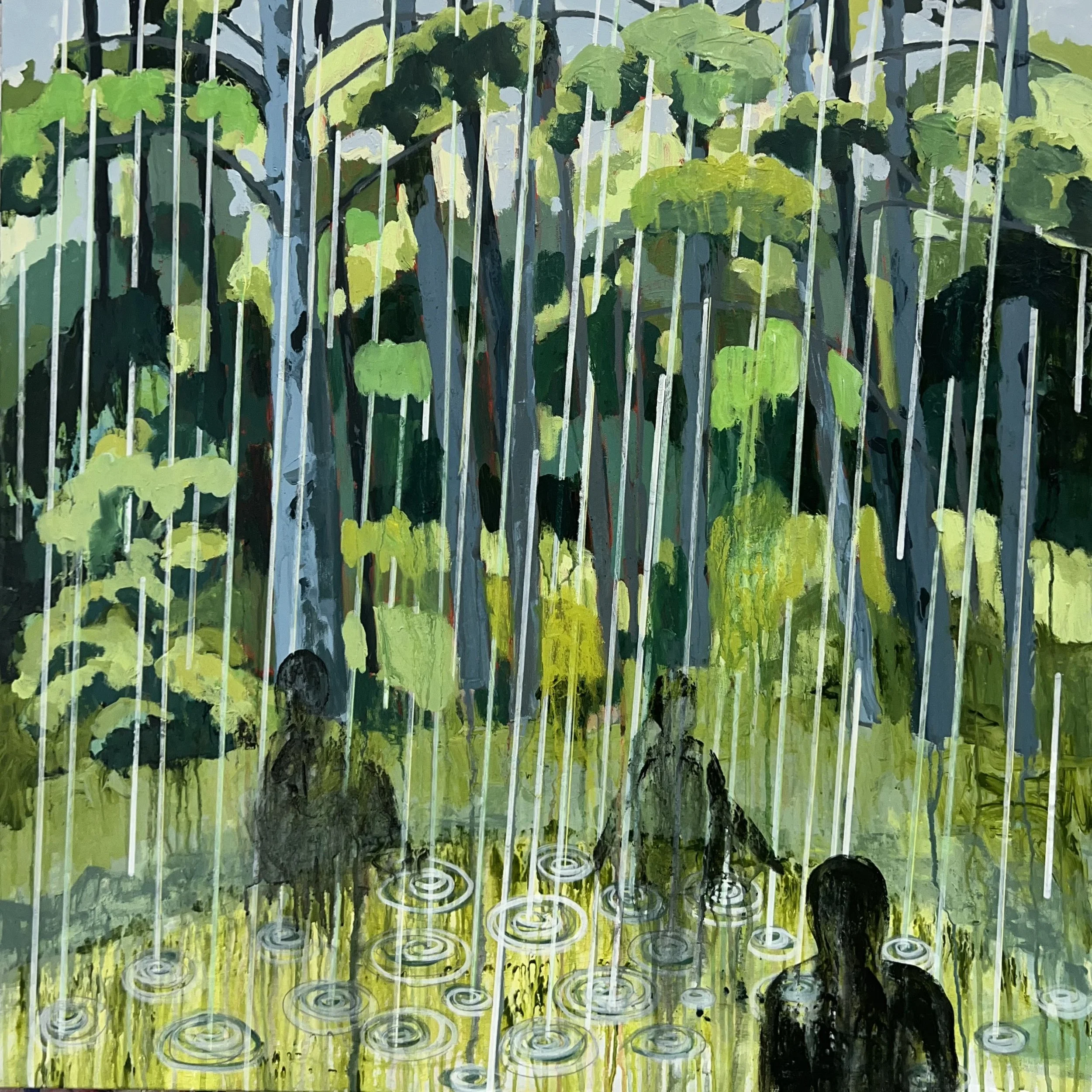 This is a painting that hums with wet, buzzing tension. Rain slices through the scene in vertical white streaks, not so much falling as marking territory. The forest is thick and stylized, a collage of green gestures and painterly shorthand, but it’s the figures—ghostlike and half-dissolved into the watery foreground—that steal the air. They aren’t bathing or wading; they’re waiting, watching, maybe haunting. The ripples are too perfect, too serene, a pattern fighting chaos. There’s something cinematic here, like a freeze-frame from a dream you’re not sure you want to remember. It’s beautiful and vaguely terrifying.